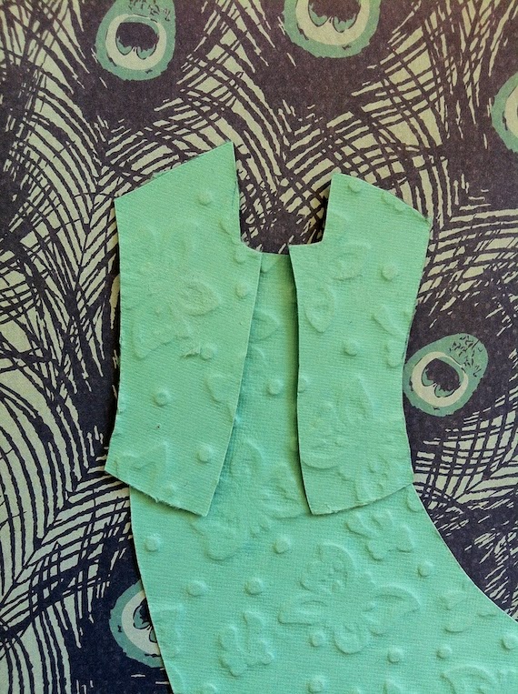 עבור הרקע בחרתי בנייר עם דוגמת נוצות טווס. בדרך כלל שאומרים על מישהו שהוא טווס, הכוונה היא שלילית, בקונוטציה של רברבן. בעיני קרן היא טווסית במובן הכי חיובי שיש,